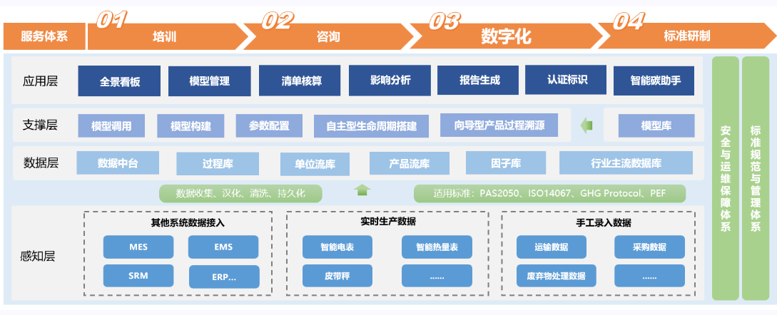 解决方案:针对企业产品碳足迹管理的实际需求,以国际 LCA 方法论为基础,提供数字化平台、培训、咨询、标准制定等一体化服务方案,助力企业搭建系统化的碳数据管理体系,提升产品碳足迹管理能力;既帮助企业精准降本增效,也能强化品牌绿色属性,增强其市场竞争优势。